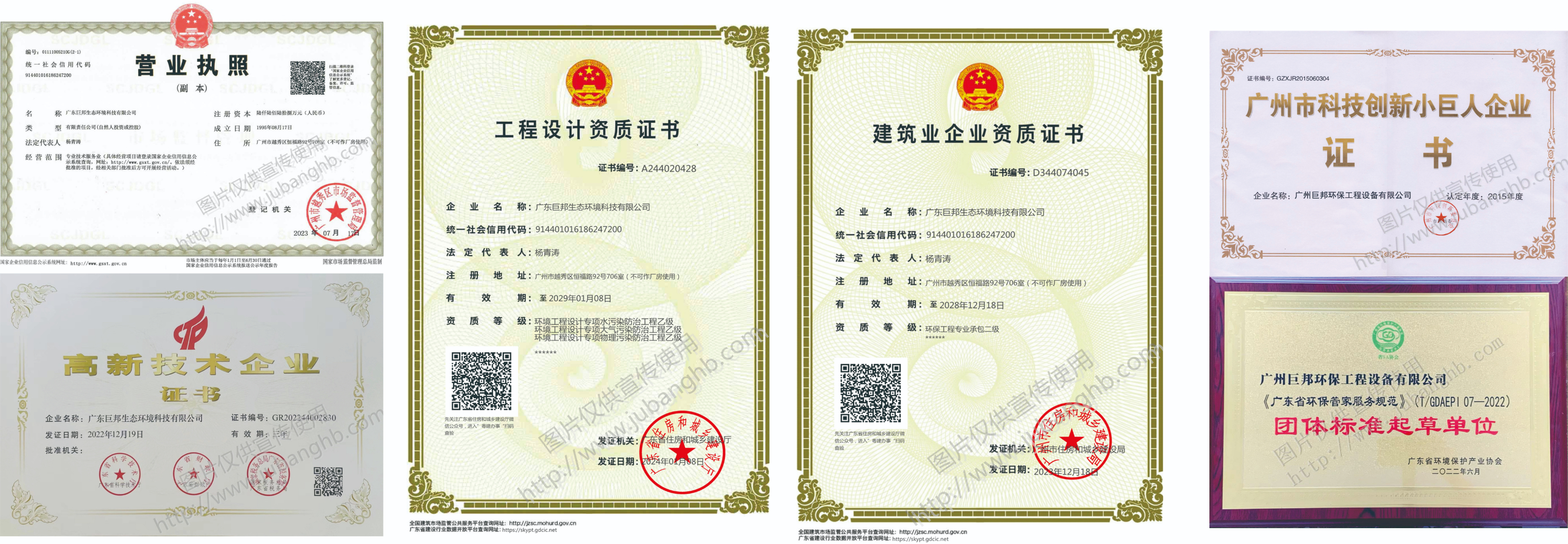 巨邦公司屬國(guó)家高新技術(shù)企業(yè),廣東省專精特新中小企業(yè),廣州市科技創(chuàng)新小巨人企業(yè);擁有國(guó)家住建部頒發(fā)的環(huán)保工程設(shè)計(jì)乙級(jí)資質(zhì)(廢水、廢氣、噪聲);擁有廣東省住建廳頒發(fā)的建筑企業(yè)環(huán)保專項(xiàng)承包貳級(jí)資質(zhì);擁有廣東省環(huán)境污染治理設(shè)施運(yùn)營(yíng)服務(wù)能力評(píng)價(jià)(工業(yè)廢水、生活污水)乙級(jí)資質(zhì);并已取得ISO9001質(zhì)量體系認(rèn)證、ISO14001環(huán)境體系認(rèn)證和ISO45001職業(yè)健康安全管理體系認(rèn)證。