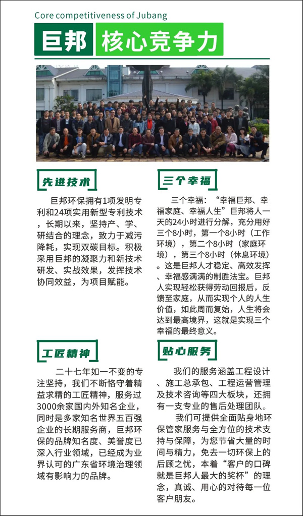 在過去的二十七年里,對于巨邦公司,是值得驕傲的27年。巨邦公司全體員工,沿著公司發展的方向,兢兢業業,努力拼搏,為共同奔向“三個幸福”的目標一同奮進。為2022年的發展鋪墊了扎實的專業技術及環境生態治理整體解決方案。