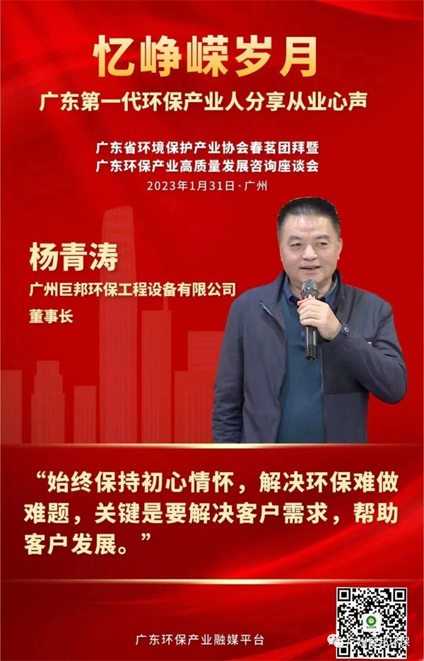巨邦公司作為廣東省老字號環保企業,楊青濤董事長作為第一代的環保產業人,于此團拜會上分享了28年以來的從業心聲。