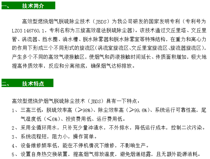 高效型燃燒煙氣脫硫除塵技術(JBDS)